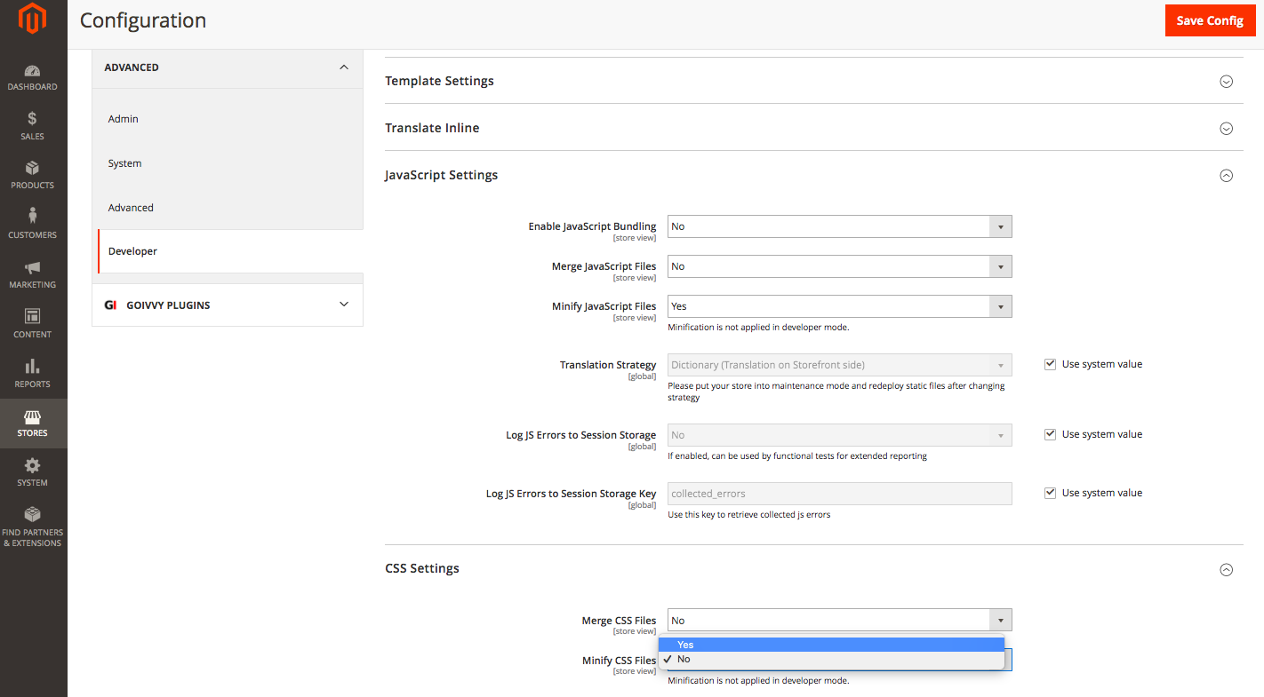 - Follow the sequence – Stores—Configuration—Advanced—Developer